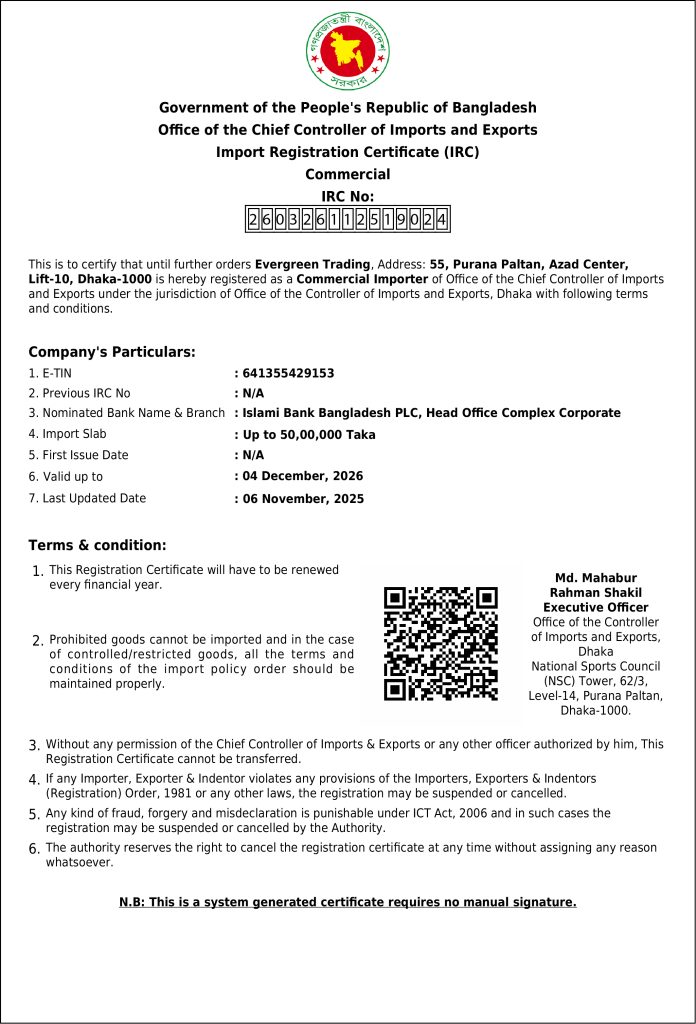 By choosing Evergreen Trading, you gain a partner committed to helping your business thrive in a competitive global market. Let us take care of your import needs while you focus on growing your business.
